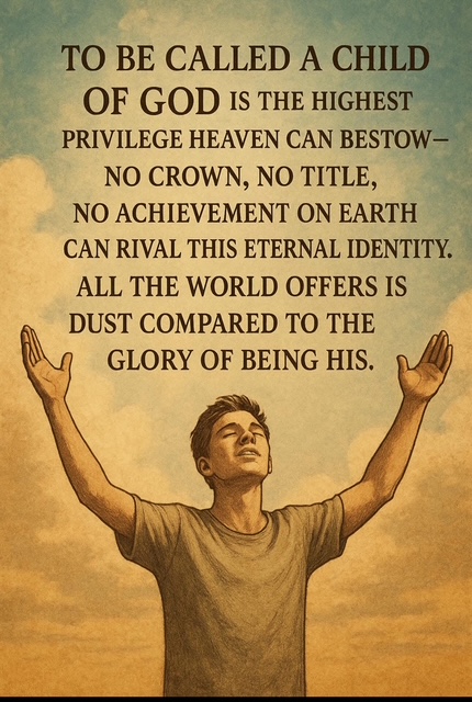 No treasure, title, or triumph in this world can equal the gift of being called a child of the Most High. it is not merely an honour – it is the ultimate fulfilment of human destiny, the very reason we exist. Nothing, absolutely nothing, on earth can rival this eternal identity. All the world offers is dust compared to the glory of being His. This one gift – to be known by God, loved as His child – outshines all the accolades of men.