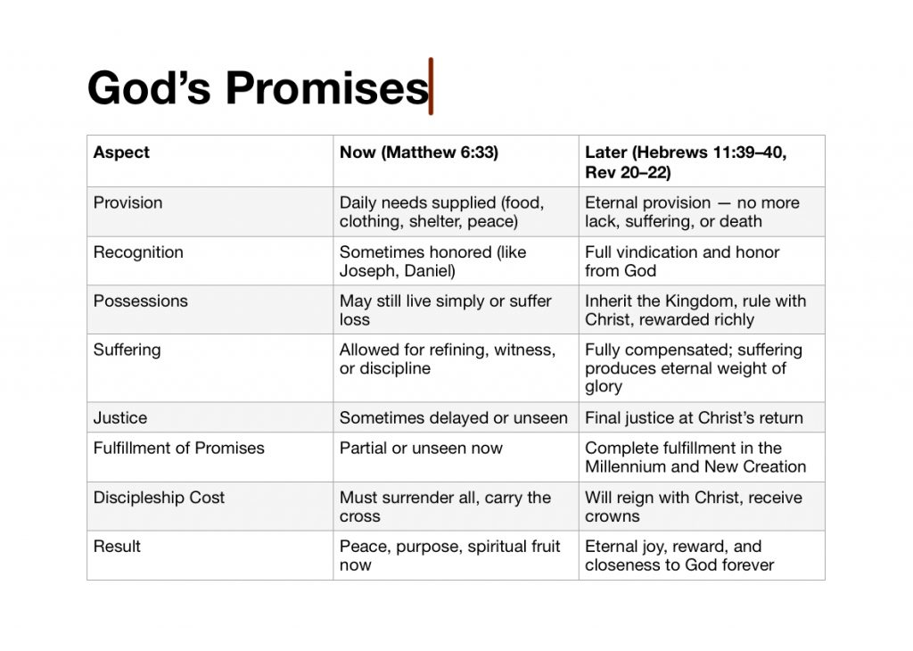 In our Christian walk in life living as exiles on earth, the Lord God had made several promises and rewards to the faithful. Some promises and rewards will not be fulfilled in this life but in the coming Millennium and New Creation. I have listed the promises for several aspects of our lives – provision, recognition, possessions, suffering, justice and discipleship cost.